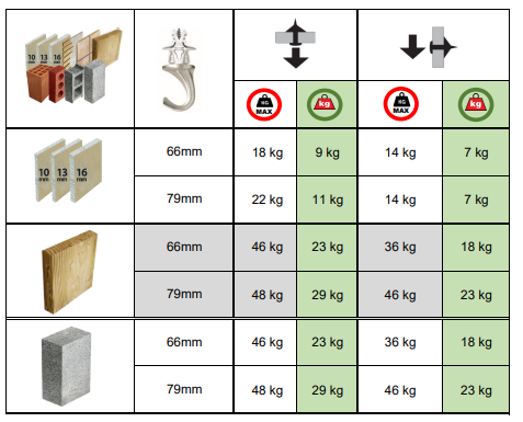 장착면 : 콘크리트, 펙보드, 타일, 목재, 석고판 6 mm, 석고판 10 mm, 석고판 13 mm