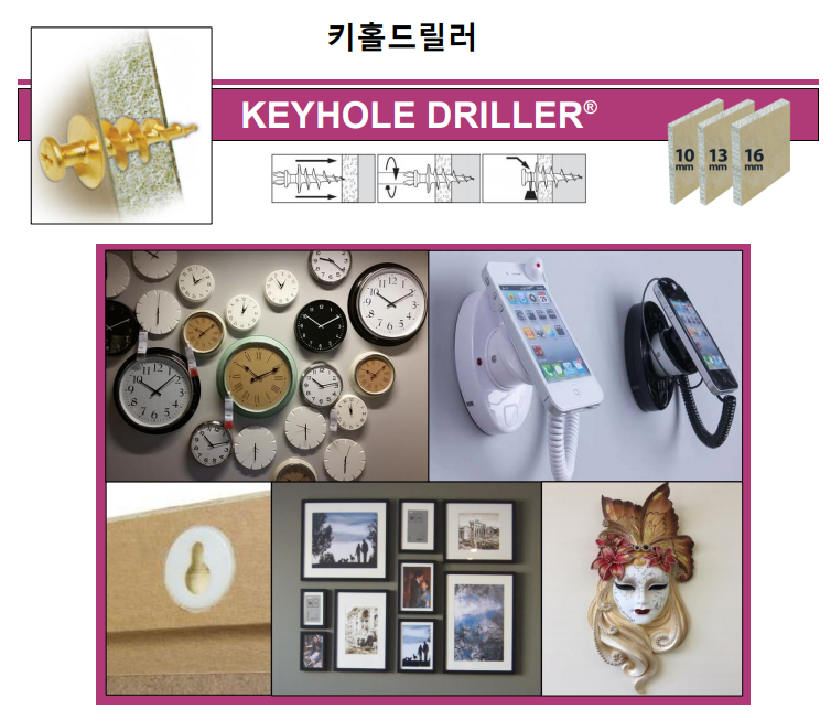 Keyhole Driller 후크의 설치 시에는 대상재료에 미리 구멍을 뚫어놓을 필요가 없으며